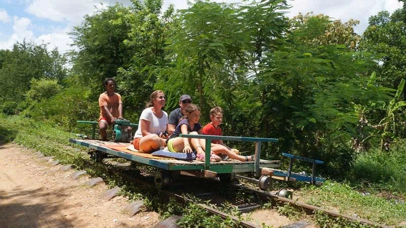 Subir al curioso tren de bambú impulsado por un pequeño motor, que se desliza a gran velocidad entre los campos de arroz.