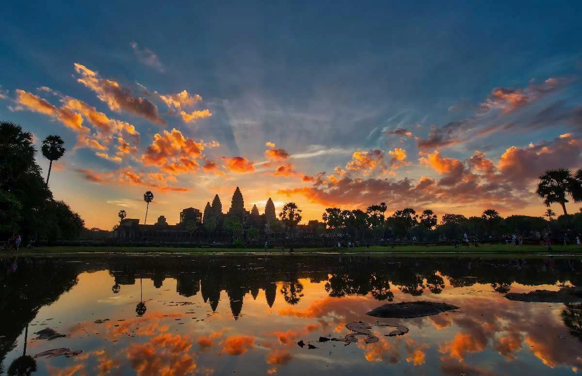 Comenzar el viaje con el impresionante amanecer en Angkor Wat, donde la silueta del templo se refleja en el estanque de lotos mientras el cielo se tiñe de tonos rosados y anaranjados. Un momento verdaderamente mágico.