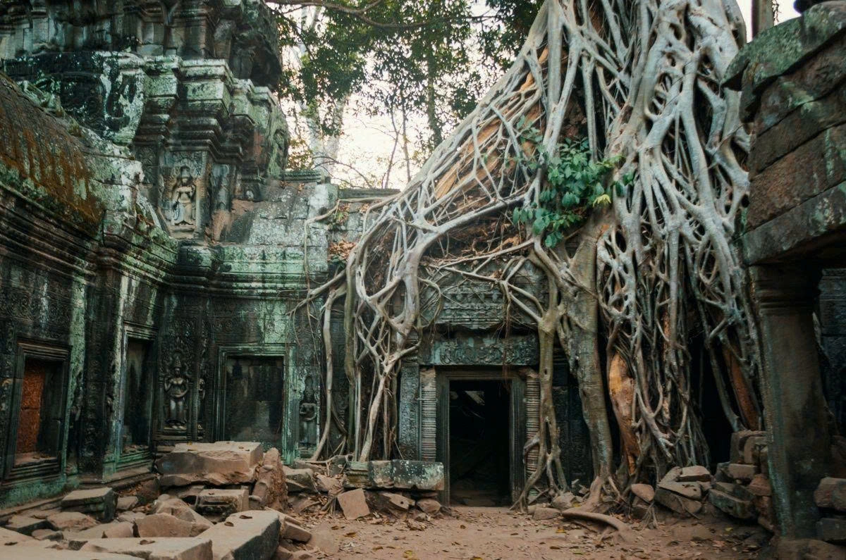 Conocido como el “Templo de Tomb Raider”, Ta Prohm está envuelto por enormes raíces de árboles, creando una atmósfera encantadora y misteriosa, como sacada de una película.
