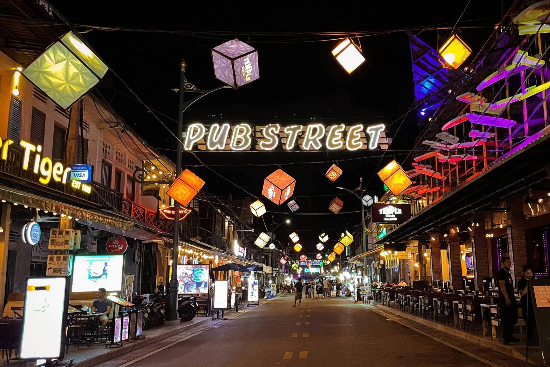 Termina el día en la animada Calle de Pub, donde las luces de colores, los bares llenos de energía y la deliciosa comida callejera camboyana crean una noche divertida.